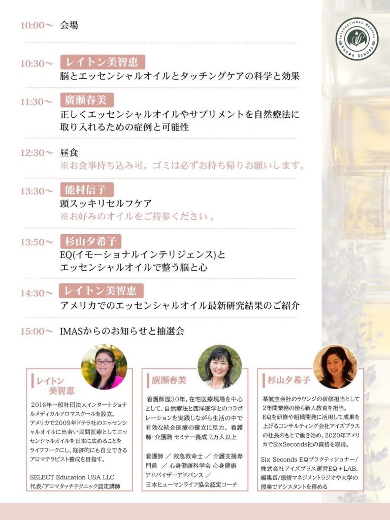 今回は私が所属するIMAS(国際メディカルアロマスクール)主催のイベントとなります。